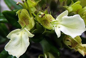 Teucrium montanum (Germandrée des montagnes) : herbacée vivace ; tige étalée ligneuse à la base ; feuilles coriaces entières, linéaire-lancéolées à bords enroulés, pubescentes blanchâtres sur leur face inférieure ; inflorescence en capitule terminal, fleurs jaune pâle, corolle bilabiée, paraissant réduite à une lèvre inférieure lobée.