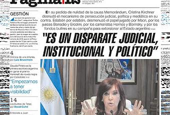 L’information figure en une de Página/12 mais non pas en vedette : celle-ci est prise par la défense que Cristina Kirchner a présentée hier, en visioconférence, devant une cour dont elle attend de sortir blanchie par un non-lieu du dossier fumeux du Mémorandum avec l’Iran (1)