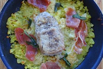 Draper les tranches de jambon cru sur la purée autour du filet mignon