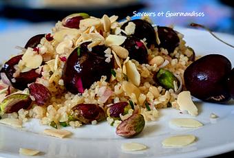Avec la chaleur de ces jours-ci, quoi de mieux que des salades variées, très variées au menu. Aujourd'hui, je vous propose entrée froide vegan aux saveurs inhabituelles : la douceur du bourghoul, la fraîcheur des cerises, le croquant des fruits secs et le parfum de l'huile de noix en font une salade originale et délicieuse.
