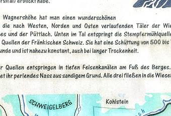 Vue depuis le lieu-dit Wagnershöhe Le point d'observation porte le nom du célèbre compositeur Richard Wagner, né à Leipzig en 1813 et mort à Venise en 1883. Le grand maître de Bayreuth a été fasciné par le romantisme du point de vue sur la charmante rivière Wiesent. Au cours de l'été 1879, le compositeur s'était rendu à Gößweinstein avec sa femme Cosima et leurs enfants. Ils ont également visité la basilique et le château qui se dresse sur un rocher escarpé. On dit souvent que Wagner aurait vu dans ce château le motif de son Château du Graal (Parsifal), mais ce 'est sans doute qu'une légende.Depuis le Wagnershöhe, on a une vue magnifique sur les vallées de Wiesent, Ailsbach et Püttlach qui s'étendent à l'ouest, au nord et à l'est. Au fond de la vallée se trouve la source Stempfermühle, l'une des plus grandes sources de la Suisse franconienne. Elle a un débit de 500 à 700 litres par seconde et est presque constante, même pendant les longues périodes de sécheresse. Deux de ces sources jaillissent dans de profonds canaux rocheux au pied de la montagne. La troisième fait jaillir son eau pétillante d'un sol sablonneux. Les trois se jettent dans la Wiesent.