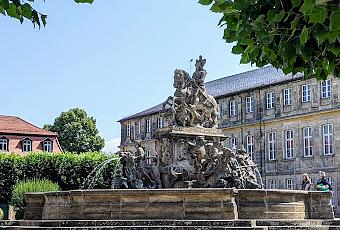 [FR] La fontaine du margrave se trouve au centre de la place de la Ludwigstrasse, devant le Neues Schloss (nouveau château). Elle fut sculptée par le sculpteur de la Cour Elias Räntz (1649). Le margrave Christian-Ernst de Brandebourg-Bayreuth (1644-1712) avait donné des ordres précis pour sa réalisation, que le sculpteur ne pouvait en rien enfreindre sans son accord. Les dessins préparatoires sont de l'architecte et sculpteur Charles Philippe Dieussart. La statue fut inaugurée en 1705. Elle représente le margrave victorieux est est entourée de quatre groupes sculptés dont les jets d'eau représentant les quatre fleuves qui naissent dans les Fichtelgebirge, la chaîne de moyennes montagnes s'étendant d'est en ouest depuis la ville de Bayreuth jusqu'à la frontière tchèque. Les groupes en eux-mêmes symbolisent quatre continents.