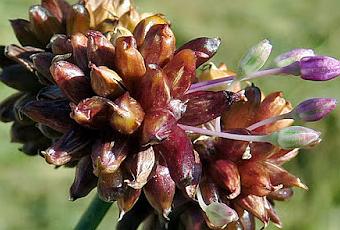 Allium vineale (Ail des vignes) : plante à bulbe et odeur d'ail ; feuilles engainantes en gouttière ; inflorescence en ombelle terminale dense, portée par un pédoncule épais ; fleurs rose-verdâtre, 6 tépales semblables, nombreuses bulbilles parfois sans aucune fleur dans l'ombelle ; spathe formée d'une seule bractée.