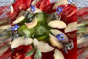 Voilà l'entrée idéale pour un soir d'été.Une salade de tomates anciennes, pêches blanches et fleurs de bourrache inspirée de celle que fait Jeff Mouroux dans le restaurant d'Avignon situé juste en-dessous du Palais des Papes et où j'ai passé une soirée très agréable loin des fureurs festivalières.