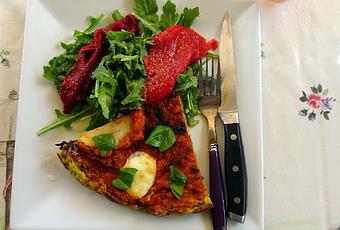 J'ai vu cette recette à la télévision italienne dans le programme "E sempre mezzogiorno" sur Rai 1. J'ai accompagnée ma "pizza" avec une salade de roquette et quelques poivrons rouges grillés. Il fallait bien que je termine les légumes au frigo. L'originalité de cette recette se trouve dans le fond de la pizza : pas de pâte faite avec uniquement de la farine, mais avec des courgettes râpées mélangées à la farine et un œuf. Cela valait le coup d'essayer. *Au lieu d'utiliser une sauce tomate toute faite achetée dans le commerce j'ai fait une sauce tomate maison. La recette ci-dessous est prévue pour 3 pizzas, pour moi j'ai donc coupé la quantité d'ingrédients par 3.