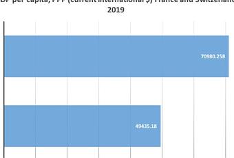 La France est plus pauvre que sa voisine, la Suisse, quand on observe le PIB (PPA) des deux pays.