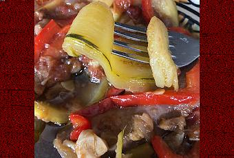 Alors j'ai décidé de vérifier cette propriété en accommodant les restes avec des tranches de courgettes posées en lasagnes sur quelques oignons rôtis dans l'huile d'olive. Bien sûr les tranches ont été "revenues" dans la cocotte avant d'être posées sur les oignons. Et cette fois je n'ai pas oublié de photographier.