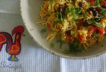 J'ai trouvé cette recette sur le blog d'une néerlandaise qui habite au Portugal et parmi les recettes qu'elle publie elle a un chapitre "portugais". J'ai déjà publié des recettes portugaises sur mon blog, mais j'aime bien en apprendre un peu plus sur cette cuisine. Alors quand j'ai vu cette recette elle m'a intriguée à cause d'un des ingrédients : les fritesticks, des pommes paille. Oui on utilise des chips en forme de fines frites. Cela m'a fait penser à la recette de Ferran Adrià qui préparait des omelettes avec des chips (recette ). J'en ai trouvé chez Lidl dans leur assortiment de base Snack Day, mais mieux vaut attendre la semaine des produits espagnols Sol y Mar et acheter les Batata Palha, beaucoup moins chers au kilo. J'en achète régulièrement pour accompagner un apéro.