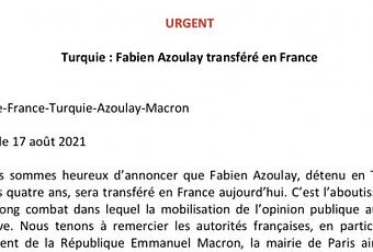 Quelques mois après l'adoption du vœu de soutien à Fabien Azoulay au Conseil de Paris, détenu depuis 4 ans en Turquie, nous sommes soulagés d'apprendre son transfert en France.
