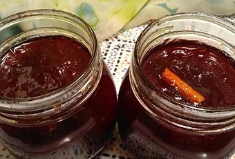 5- Sacar la mermelada del fuego, añadir las ramitas de canela y la mantequilla, y mezclar. Dejar enfriar la mermelada durante 15 minutos y luego verterla en los frascos esterilizados calientes. Cerrar los frascos, invertirlos inmediatamente y dejar de lado hasta que estén completamente fríos.