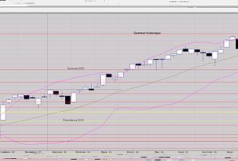 Le graphe des bougies quotidiennes montre bien ce qui s'est produit cette semaine tout d'abord avec l'ouverture d'une fenêtre baissière lundi.Cette 1ère séance a été marquée par les inquiétudes provenant de Chine et d'Afghanistan, rejointe par une nouvelle séance baissière jeudi après les annonces de la FED et l'ouverture d'une grande fenêtre baissièreLa semaine se termine par une séance de stabilisation sur un retracement de 50% de la hausse démarrée mi juillet et par la formation d'un creux en pince.Il va donc falloir surveiller le support créé par cette figure et quelle sera la force du courant acheteur face aux vendeurs après un début de test de cette fenêtre un peu timide.Excès vendeur, réaction timide des acheteurs à la veille d'un week end restent difficile à déchiffrer.Dans un peu plus d'une semaine, la bougie du mois d'août sera définitivement formée. A ce stade, la baisse de cette semaine n'a aucun moment menacé la tendance haussière de moyen terme.