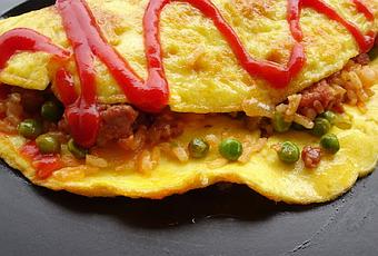 Battre les œufs avec le lait et un peu de poivre noir du moulinart du riz au milieu de l'omelettePlier l'omelette en deux