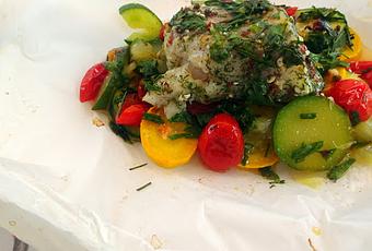 Encore une recette du livre de cuisine "Les Copains d'abord" du chef Pierre Gagnaire que mon invité du mercredi m'avait offert pour mon anniversaire. J'aime bien les préparations à la papillote, impossible de les rater. Une profusion de légumes et d'herbes aromatiques !