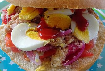 Garnir le pain de tomates, de thon et de l'œuf coupé en tranches et l'oignon blanchi