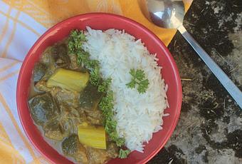 Je pense l'avoir déjà dit, si j'affectionne beaucoup la rhubarbe, que ce soit sous forme de tarte ou de crumble, je crois que c'est encore en salé que je l'aime le plus. Sans doute parce que c'est là que l'on ne l'attend pas. J'aime glisser quelques tronçons de rhubarbe dans mes tournées de légumes au four par exemple. J'apprécie autant sa saveur acidulée que la texture qu'elle donne aux plats en se délitant à la cuisson. C'est d'ailleurs la seule difficulté de ce plat : arriver à ce que la rhubarbe soit bien cuite et fondante, mais pas totalement dissoute tout de même ! Je ne sais pas trop comment m'est venue cette idée d'associer rhubarbe et aubergine dans un curry, mais je dois dire que c'est plutôt réussi. Les saveurs complètent bien, entre la suavité de l'aubergine, l'acidulé de la rhubarbe et l'épicé du curry. Il s'agit ici d'un curry particulièrement crémeux, puisque autant l'aubergine que la rhubarbe ont la particularité de fondre à la cuisson. Si j'essaye la plupart du temps de limiter l'us