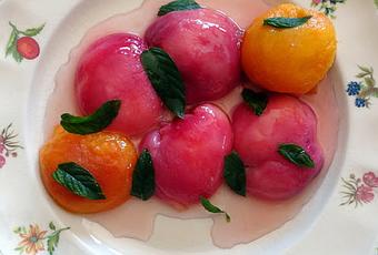 Servir les pêches en y versant un peu de sirop réduit et garnir avec des feuilles de menthe