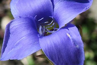 Gentianopsis ciliata (Gentiane ciliée) : herbacée à tige non ramifiée, dressée, portant des feuilles lancéolées-linéaires, entières, opposées ; fleur solitaire terminale, corolle bleu intense à 4 lobes ciliés à la gorge.