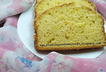 5- تضاف المكونات الجافة إلى الخليط السائل. يمزج الكل برفق. يُسكب المزيج في قالب الكيك ويُخبز لمدة 45-50 دقيقة. يخرج الكيك من الفرن و يترك في القالب مدة عشر دقائق ثم ينقل الى شبكة البيسكوي و يترك الى ان يبرد تمامًا.