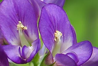 Medicago sativa subsp. sativa (Luzerne cultivée) : feuilles à 3 folioles, allongées, dentées à leur extrémité ; fleurs papilionacées violettes, en grappe oblongue : gousses spiralées.