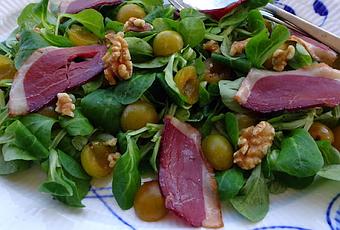 C'est la saison des mirabelles et comme elle est très courte c'est maintenant le moment d'en profiter. Ce que j'ai fait quand je les ai vues au marché. J'en ai mangé quelques unes comme çà, mais j'avais envie de les utiliser également dans une recette. En cherchant je suis tombée sur cette salade sur le site Guide des vins du Centre Leclerc. Comme j'aime bien le mélange sucré salé j'ai préparé cette salade que j'ai bien aimée et que je vous recommande. Par contre, je n'ai pas mélangé tous les ingrédients comme décrit ci-dessous : j'ai préféré présenter la mâche sur l'assiette et la couvrir avec les autres ingrédients, sans les mélanger, puis verser la vinaigrette sur l'ensemble.