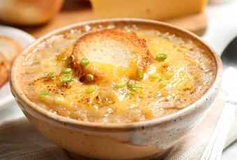 Servir la soupe gratinée à l'oignon bien chaude accompagnée de plat de viande ou de poisson.
