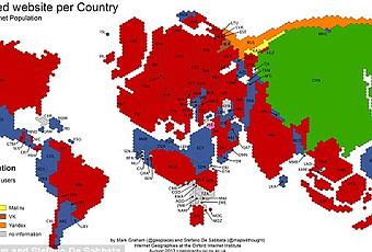 La mappe créée par les chercheurs de du Oxford Internet Institute, utilisant des données de centaines de million d’utilisateurs de part le monde, montre que Google est le moteur préféré dans 62 pays.
