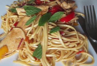 Hors du feu mélanger les pâtes avec la mangue et 2/3 de la menthe