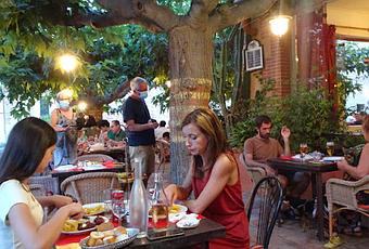 On y mange toutes sortes de brochettes, accompagnées d'aïoli, harissa et moutarde. Et bien sûr les frites ne peuvent pas manquer. Ambiance sympa.