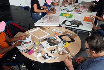Autour d’une table pleine de cartes postales, de magazines et de divers visuels, l’artiste Laurence Tocco a partagé sa pratique du collage avec les familles en les initiant à l’art du détournement. Après avoir montré quelques unes de ses oeuvres, l’artiste a accompagné le groupe dans la réalisation de leurs propres collages.