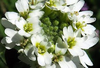 Berteroa incana (Alysson blanc) : herbacée annuelle ou bisannuelle ; tige couchée-ascendante ; feuilles ovales lancéolées, entières, courtement pétiolées ; inflorescence en grappe spiciforme, petites fleurs à 4 pétales blancs profondément échancrés, silicules elliptiques pubescentes.