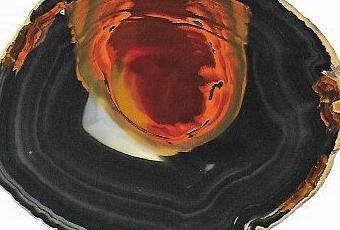 Le bleu d’orage d’une calcédoine nocturne emplit une autre fois la surface de la pierre. Sur le bord, des taches de pourpre ou de vermillon s’élargissent autour de voiles livides tranchés net par le polissage. Leur traine oblique disparaît vite dans l’épaisseur du minéral, comme guenilles prises par la glace. Tout en bas, des strates laiteuses, plus claires ou plus foncées, dessinent autant d’horizons étagés ou les reflets d’un astre invisible sur l’avancée des vagues parallèles. Au dessus, d’énormes nuées frémissent de mille menaces obscures et d’une plus explicite : en guise d’ultime semonce, un météore consumé en plein ciel par sa propre chute fait un accroc tragique aux ténèbres.