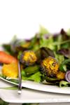 Salade Contrastes en Harmonie - aux agrumes, billes de fromage épicées et noix de St Jacques -