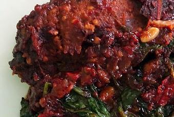 Probablement cette photo ne va pas vous inspirer pourtant je peux affirmer que ce kefta végétarien est très savoureux grâce à tous les épices. On le sert avec une sauce tomate aux épinards.