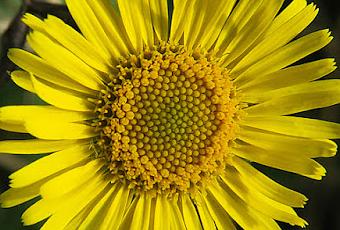 Pulicaria dysenterica (Pulicaire dysentérique) : herbacée vivace odorante à tige dressée ramifiée, cotonneuse ; feuilles alternes, ovales lancéolées, embrassantes, ondulées et gaufrées, cotonneuses ; inflorescence en corymbe de capitules à fleurs tubulées et ligulées rayonnantes jaunes.