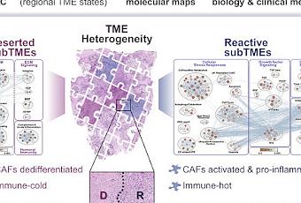 "Nous découvrons des sous-TME (...), des états tissulaires histologiquement définissables ancrés dans la plasticité des fibroblastes, avec des relations régionales avec l'immunité tumorale, les sous-types, la différenciation et la réponse au traitement. Les sous-TME "réactifs" riches en communautés de fibroblastes complexes mais fonctionnellement coordonnés étaient immunisés et habités par des phénotypes de cellules tumorales agressifs (...)"