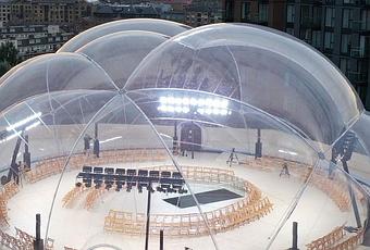 La maison de mode de luxe, qui est présente habituellement à la Fashion Week de Paris (qui s'est achevé la semaine dernière), a installé un dôme géant à bulles transparent sur le toit d'un entrepôt de 10 étages dans l'Est de Londres. Signé par l'architecte Smiljan Radic, la structure éphémère fait suite à une collaboration qui vue naître également la boutique Londonienne de la marque.