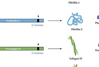 Description schématique de la formation des caudamines à partir du clivage au niveau C-terminal de protéines "non-hormonales" de dimension beaucoup plus importante, indépendantes sur le plan fonctionnel.Ainsi, l'asprosine provient du clivage C-terminal de la Fibrilline 1, la placensine à partir du clivage de la Fibrilline 2, l'endotrophine à partir du clivage du collagène VI, et l'endostatine à partir du clivage du collagène XVIII.