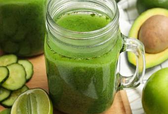 D'abord pelez la concombre, pomme, kiwi et coupez-les en petits morceaux, coupez la chair d'avocat en cubes et lavez les feuilles d'épinards ou de menthe.