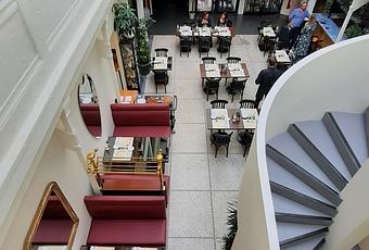 Il occupe une grande partie du rez-de-chaussée, un long bar à gauche, et une série de banquettes rouges à gauche le long du mur, avec un ensemble de tables au milieu. Mobilier disparate, certaines tables en pieds acajou provenant du Georges V, d’autres ventes également au fil des occasions que sait saisir le boss. Il connait bien pour avoir ardemment fréquenté ce monde de la restauration.