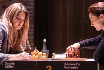 La partie de la première ronde avait rapidement tourné en faveur de la Française Sophie Milliet qui a eu deux occasions de marquer le point face à la Russe Alexandra Kosteniuk. Malheureusement le réalisme de la plus francophile des championnes russes lui a permis de retourner les tables et marquer finalement le point. Rejouer la partie d'échecs ci-dessous.