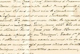 [...] Nous procédons à l'examen du cadavre, lequel paraît être celui d'une femme âgée d'environ 60 ans et dont voici le signalement :