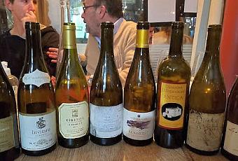Vin 1 : Un nez assez typique de pêche, de guimauve violette, sur un fond légèrement résine, cire d'abeille. La bouche attaque sur une note champignon, mais de cave, pas de sous-bois... (voir serpillère) léger bouchon ? c'est gras, structuré, sur la pêche, la guimauve. Finale sur la puissance alcoolique, ample, mais du coup rondelette. B 85 (14) A mon avis, la bouteille à un problème. Condrieu La Bonette Rostaing 2017