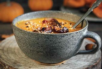 Répartissez la soupe dans les bol, ajoutez des morceaux d'oignons rouges confits et un peu de noisettes concassées .