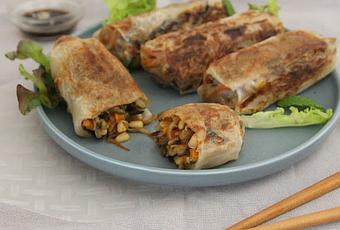 Ce n'est pas la première fois que je tente de faire des nems aux légumes, mais c'est la première fois que je suis satisfaite du résultat ! Dans mes précédents essais, il y a avait toujours un "je ne sais quoi" qui manquait. Aussi j'avais définitivement renoncé aux nems maison, mais lorsque j'ai vu la recette de Cléa et les pousses de haricot mungo dans mon épicerie préférée, j'ai eu envie de retenter ma chance. Et bien m'en a pris ! Je ne sais pas si c'est le combo pousses de haricots mungo-champignons noirs, l'ajout d'huile de sésame grillé ou autre, mais cette fois-ci, j'ai vraiment eu l'impression de manger quelque chose qui ressemblait à des nems. Moi qui m'en faisait tout un monde, je sens que cela va devenir un de mes classiques. Pour la cuisson, j'ai testé aussi bien la cuisson au four que dans une poêle légèrement huilée (la grande friture, c'est pas trop mon truc), et les deux ont donnés de bons résultats. Je pense que ma préférence allait tout de même à la version à la poêle, mais il faut dire que mon four donne des signes de faiblesse, alors c'est pas toujours facile d'obtenir une cuisson correcte avec !
