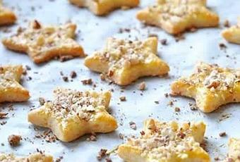 Une fois cela fait, commencez à étaler la pâte brisée au parmesan avec un rouleau à pâtisserie, jusqu'à obtenir une feuille assez fine. Maintenant, à l'aide d'un emporte-pièce, commencez à faire plein d'étoiles de Noël. Répétez l'opération jusqu'à épuisement de la pâte. Disposer toutes les étoiles obtenues sur une plaque à pâtisserie recouverte de papier sulfurisé et les badigeonner de jaune d'œuf, puis saupoudrer un peu d'amandes concassées sur chaque starlette de parmesan et enfin enfournez à 180°C (four statique) pendant environ 10 minutes. Ils seront prêts quand ils seront dorés...