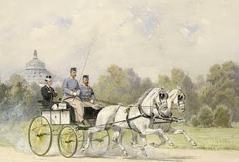 [EN] The Prince of Wales driving with Rudolph, Crown Prince of Austria in the Prater, Vienna dated 1888.Rhe two Princes driving in a wagonette, to right. The Prince of Wales wearing uniform of the 12th Hungarian Hussars; the Crown Prince wears Hungarian General Officer's uniform. Exhibition building in the distance.[DE] Der Prinz von Wales fährt mit Rudolph, Kronprinz von Österreich, im Prater, Wien, 1888. Der Prinz von Wales trägt die Uniform der 12. ungarischen Husaren; der Kronprinz trägt die Uniform eines ungarischen Generalstabsoffiziers. In der Ferne das Ausstellungsgebäude.