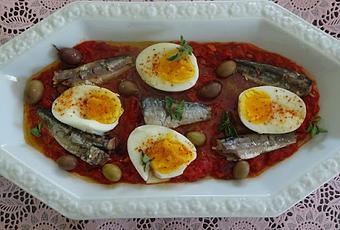 Garnir avec les sardines à l'huile, les moitiés d'œufs durs saupoudrés de piment d'Espelette, les olives et quelques feuilles de marjolaine.