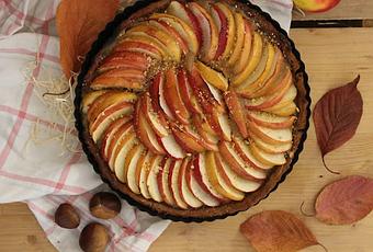 Préparer la pâte : Dans un saladier, mélanger les farines et le sucre. Ajouter l'huile de coco amollie et la purée de noisette ou d'amande. Mélanger du bout des doigts pour obtenir une texture sableuse. Lier en ajoutant de l'eau cuillerée par cuillerée. Former une boule et laisser reposer au moins 30 minutes au frais. Préparer la compote : Eplucher les pommes à cuire, les couper en gros morceaux et les placer dans un casserole avec les châtaignes. Ajouter un tout petit fond d'eau et laisser compoter à feu doux et à couvert, en remuant de temps en temps pour s'assurer que cela n'accroche pas, jusqu'à ce que les châtaignes se délitent et les pommes soient fondantes. Mixer finement ajouter la purée de noisette, mélanger à nouveau et réserver.Faire chauffer le four à 180°C.Etaler la pâte sur une épaisseur d'environ 0,3 cm et en foncer un moule à tarte. Piquer à la fourchette, lester de petits cailloux, de billes de céramique ou de haricots et faire cuire la pâte à blanc 20 minutes.Pendant ce temps, couper les pommes restantes en lamelles, et les citronner pour éviter qu'elles ne noircissent. Lorsque la pâte est cuite, répartir dessus la compote pomme-châtaigne-noisette. Disposer dessus les lamelles de pommes. Faire cuire encore une vingtaine de minutes : les pommes doivent être bien cuites. Laisser refroidir avant de servir.