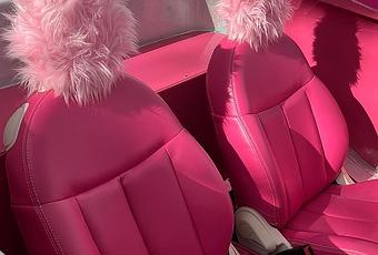 Également des jantes en arc-en-ciel et le logo de la marque inscrit en gros sur le capot et sur les roues. Les sièges et le tableau de bord sont, bien sûr, peints en rose Barbie par excellence. Sans oublier les appuis tête en fourrure rose.