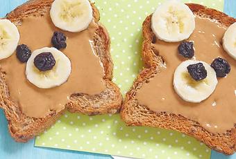 Laissez refroidir un moment, démoulez et coupez en tranches puis tartinez chaque tranche avec le chocolat, décorez avec 3 rondelles de bananes et 3 raisins secs.